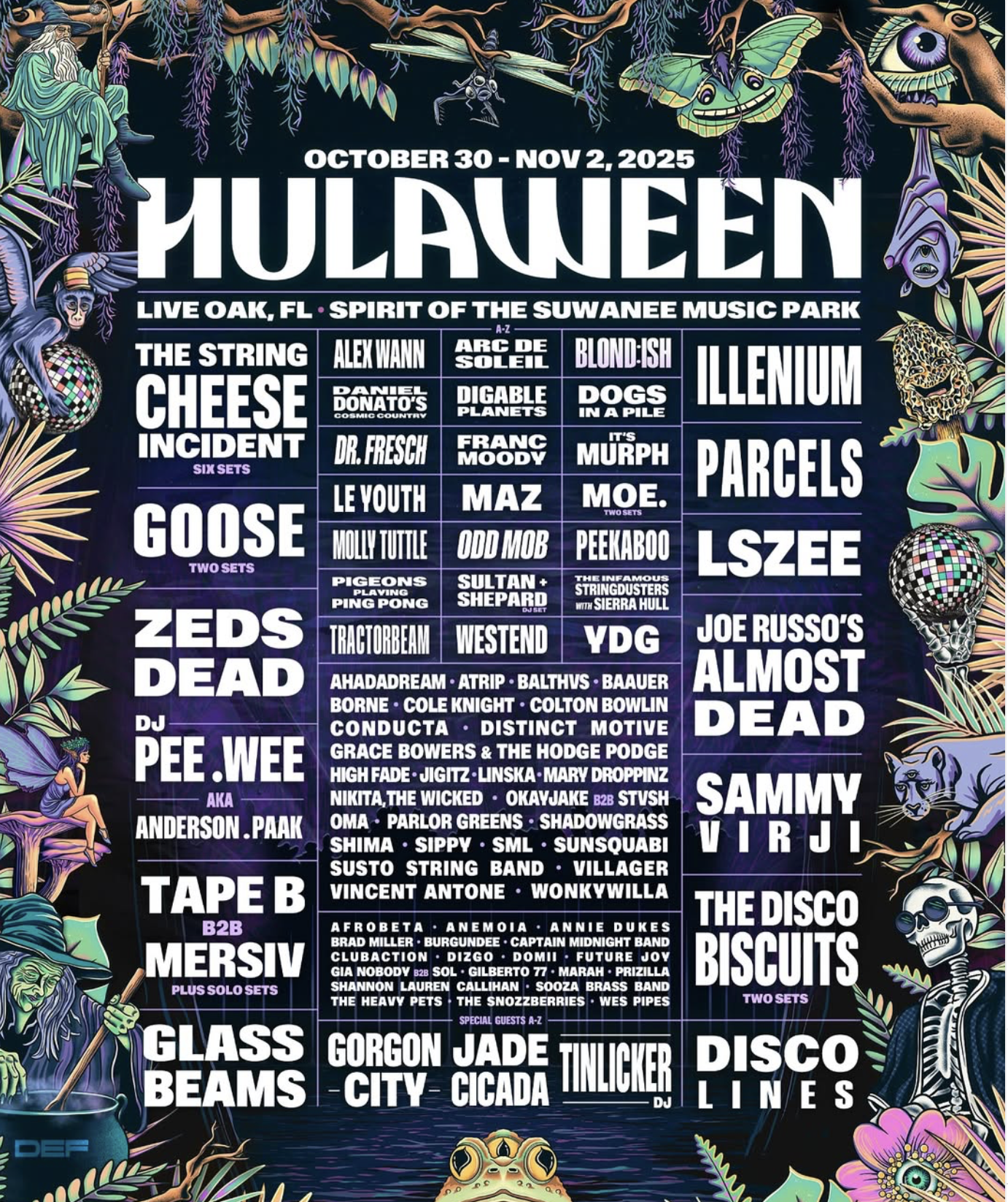 Suwannee Hulaween has announced its 2025 return to the Spirit of the Suwannee Music Park from October 30th to November 2nd, and this year’s lineup is an absolute must attend event.