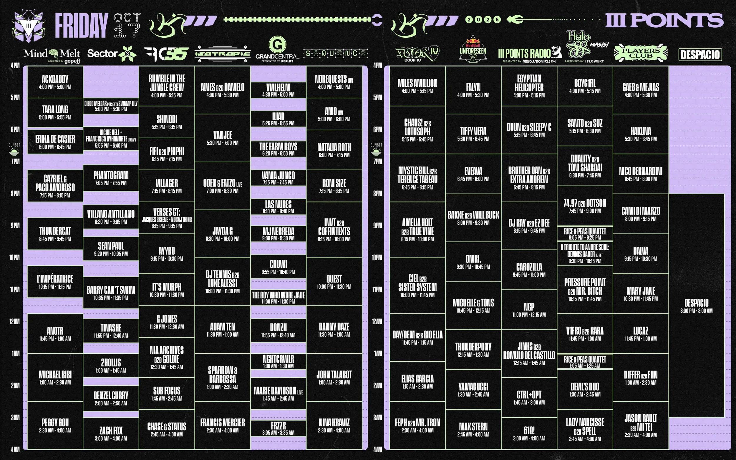Miami’s most innovative music festival, III Points, has officially revealed its 2025 set times, setting the stage for one of the city’s most anticipated weekends. Taking place October 17th and 18th, the announcement gives fans a clear look at how to plan their nights across 11 immersive stages. With music running from 4 PM to 4 AM, the schedule promises two unforgettable evenings of energy, artistry, and exploration in the heart of Wynwood.
